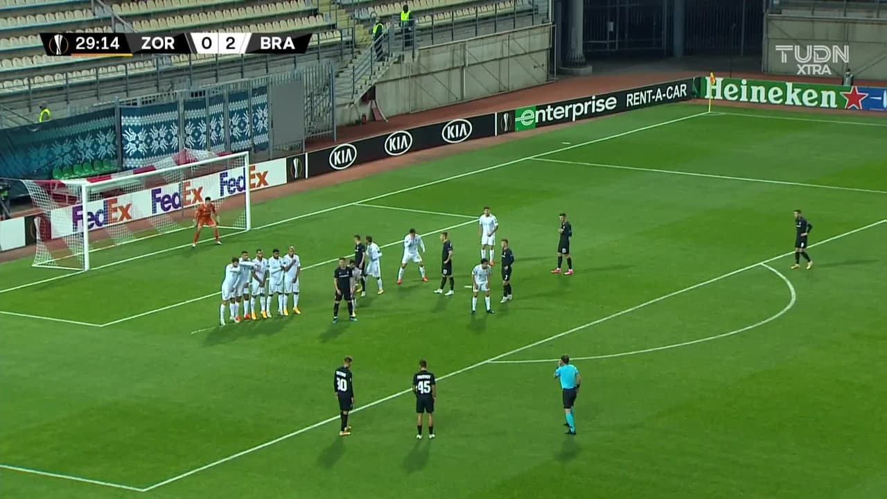 Tiro atajado junto al lado derecho de la portería. Vladlen Yurchenko (Zorya Luhansk) Disparo con la derecha desde fuera del área.