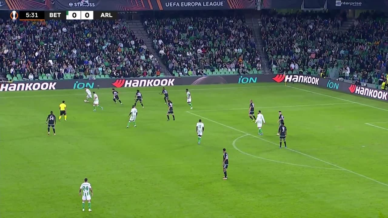 Tiro atajado. William Carvalho (Real Betis) Disparo con la derecha desde fuera del área.