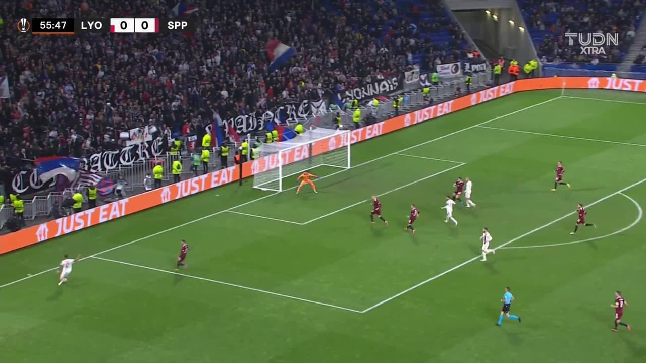 Tiro atajado. Xherdan Shaqiri (Lyon) zurdazo desde el lado derecho dentro del área.