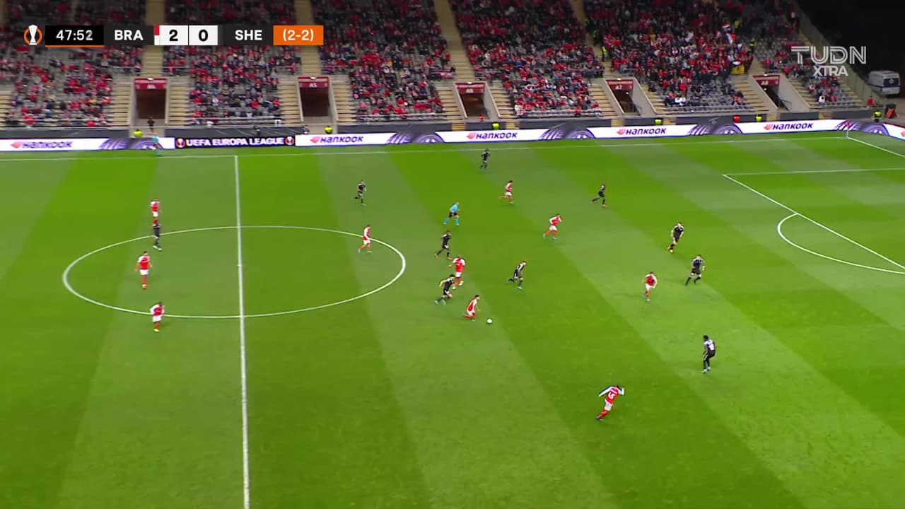 Tiro atajado junto al lado derecho de la portería. Yan Couto (Sporting Braga) zurdazo desde fuera del área.