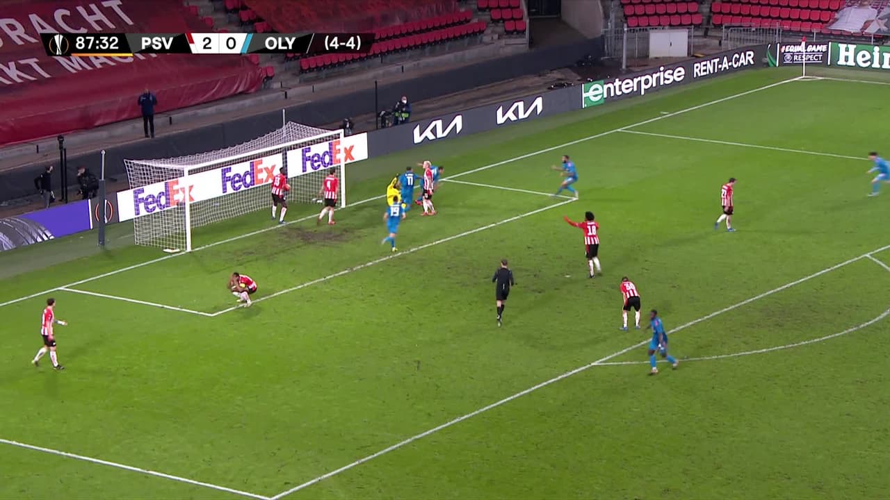 Tiro atajado junto al lado derecho de la portería. Youssef El-Arabi (Olympiakos) disparo de cabeza desde el centro del área. Asistencia de Konstantinos Fortounis con un centro al área.