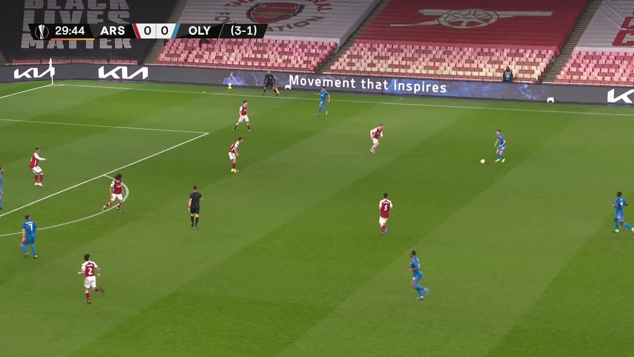 Tiro atajado. Youssef El-Arabi (Olympiakos) disparo de cabeza desde el centro del área.