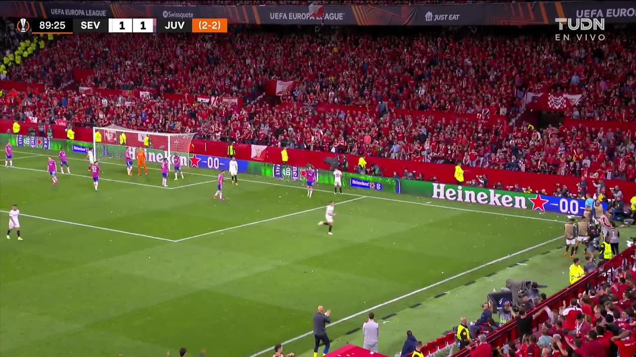 Tiro atajado al ángulo superior derecho. Youssef En-Nesyri (Sevilla) disparo de cabeza desde el centro del área. Asistencia de Suso con un centro al área.