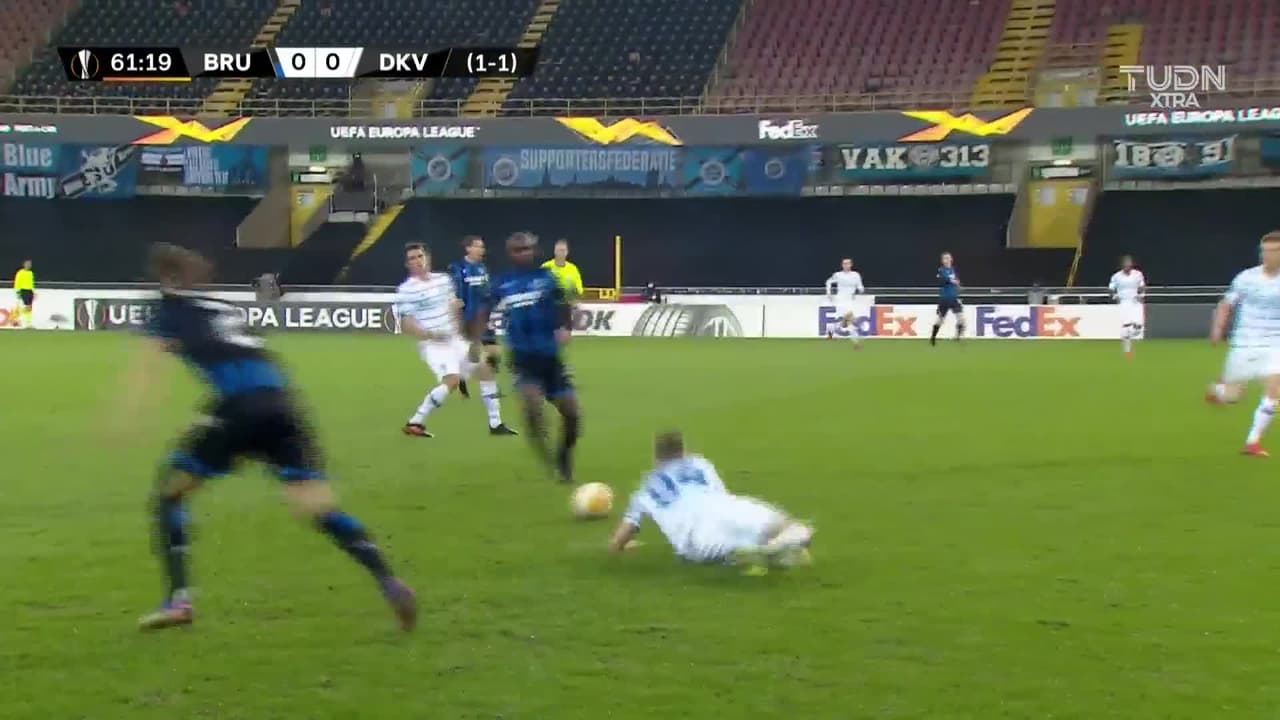 Tiro atajado raso al centro del arco. Youssouph Badji (Club Brugge) Disparo con la derecha desde el lado derecho dentro del área. Asistencia de Nabil Dirar.