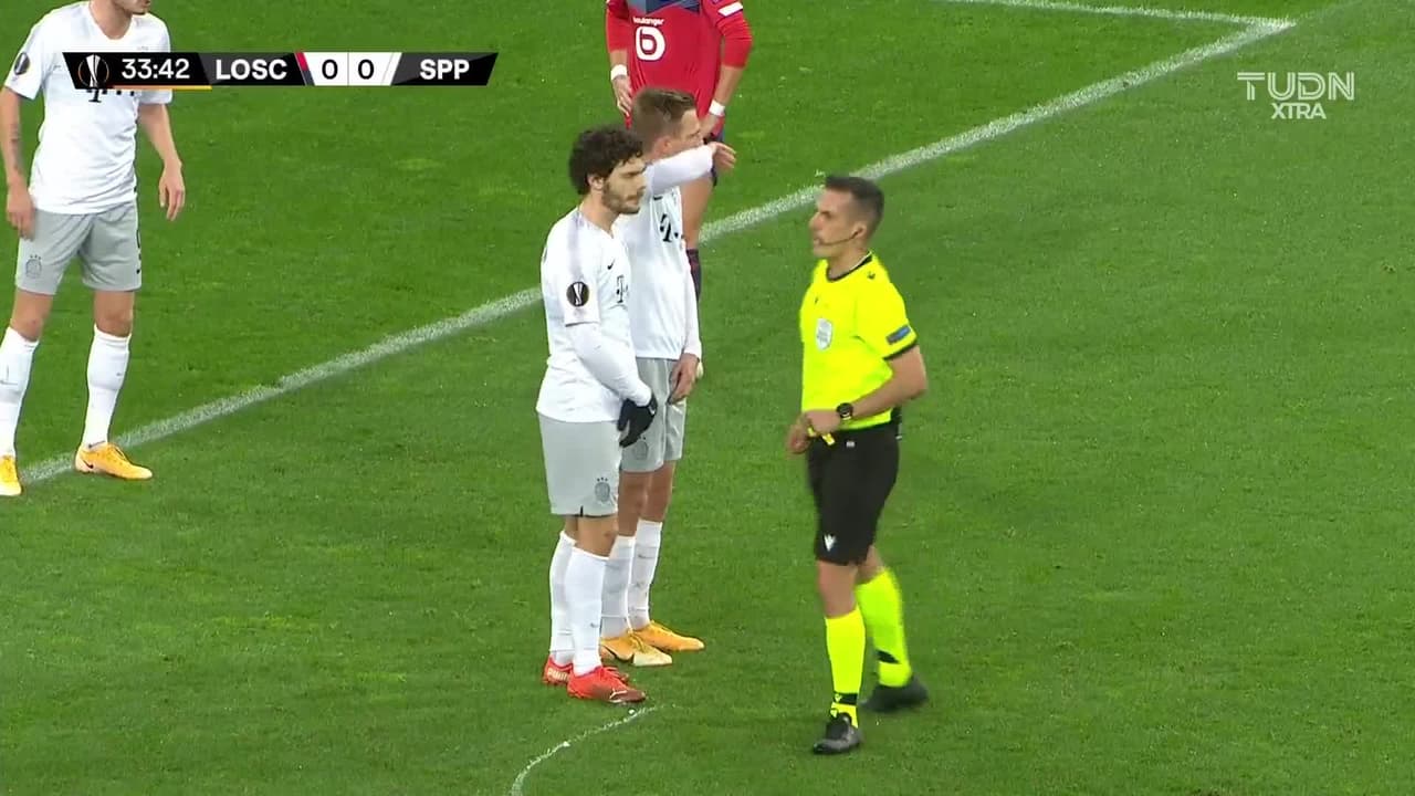 Tiro atajado al ángulo superior derecho. Yusuf Yazici (Lille) zurdazo desde fuera del área.