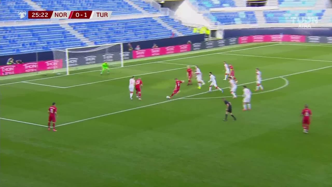 Alexander Sørloth (Noruega) remata al poste derecho| zurdazo desde fuera del área.