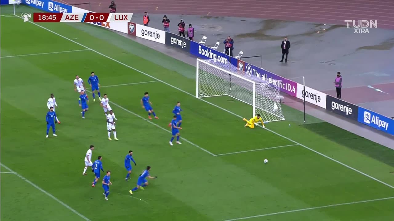Danel Sinani (Luxemburgo) remata al poste derecho| zurdazo desde fuera del área de tiro libre directo.