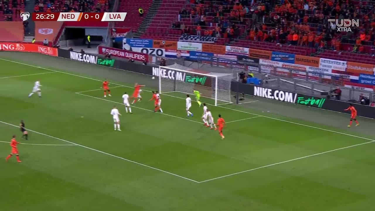 Davy Klaassen (Holanda) remata al travesaño| disparo de cabeza desde muy cerca. Asistencia de Steven Berghuis.