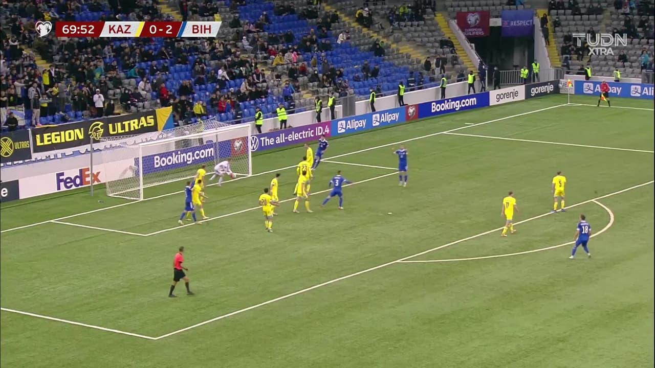Edin Dzeko (Bosnia-Herzegovina) remata al poste derecho| disparo de cabeza desde muy cerca. Asistencia de Amer Gojak con un centro al área tras un saque de esquina.