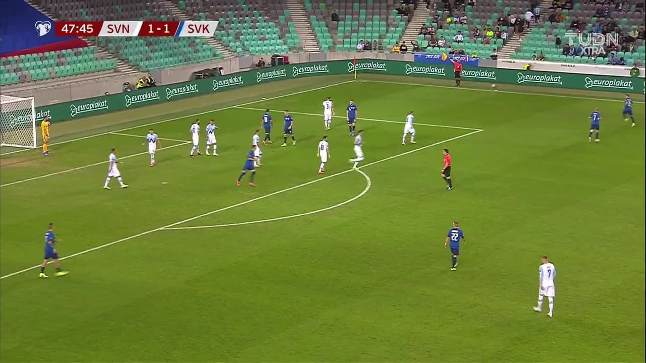 Juraj Kucka (Eslovaquia) remata poste, remate de cabeza a quemarropa desde el lado izquierdo.