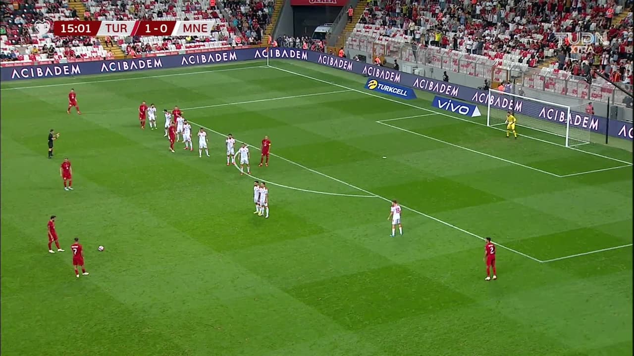 Kaan Ayhan (Turquía) remata poste, remate con la derecha desde el lado izquierdo del interior del área tras botar una falta.
