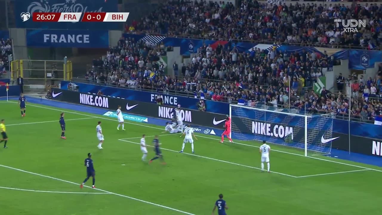 ¡CERCA! Kylian Mbappé disparó que se estrella en el poste.