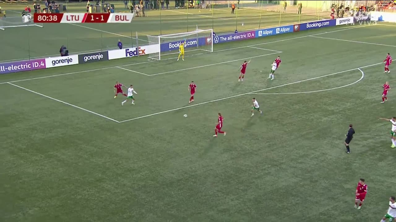 Linas Klimavicius (Lituania) remata al travesaño| disparo de cabeza desde el centro del área. Asistencia de Arvydas Novikovas tras el cobro de una falta.