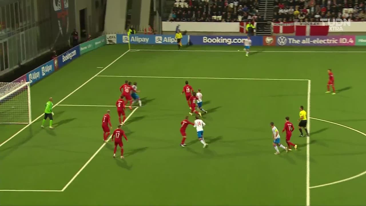 Meinhard Egilsson Olsen (Islas Feroe) remata al larguero, remate de cabeza desde muy cerca. Asistencia de Meinhard Egilsson Olsen con un pase de cabeza.