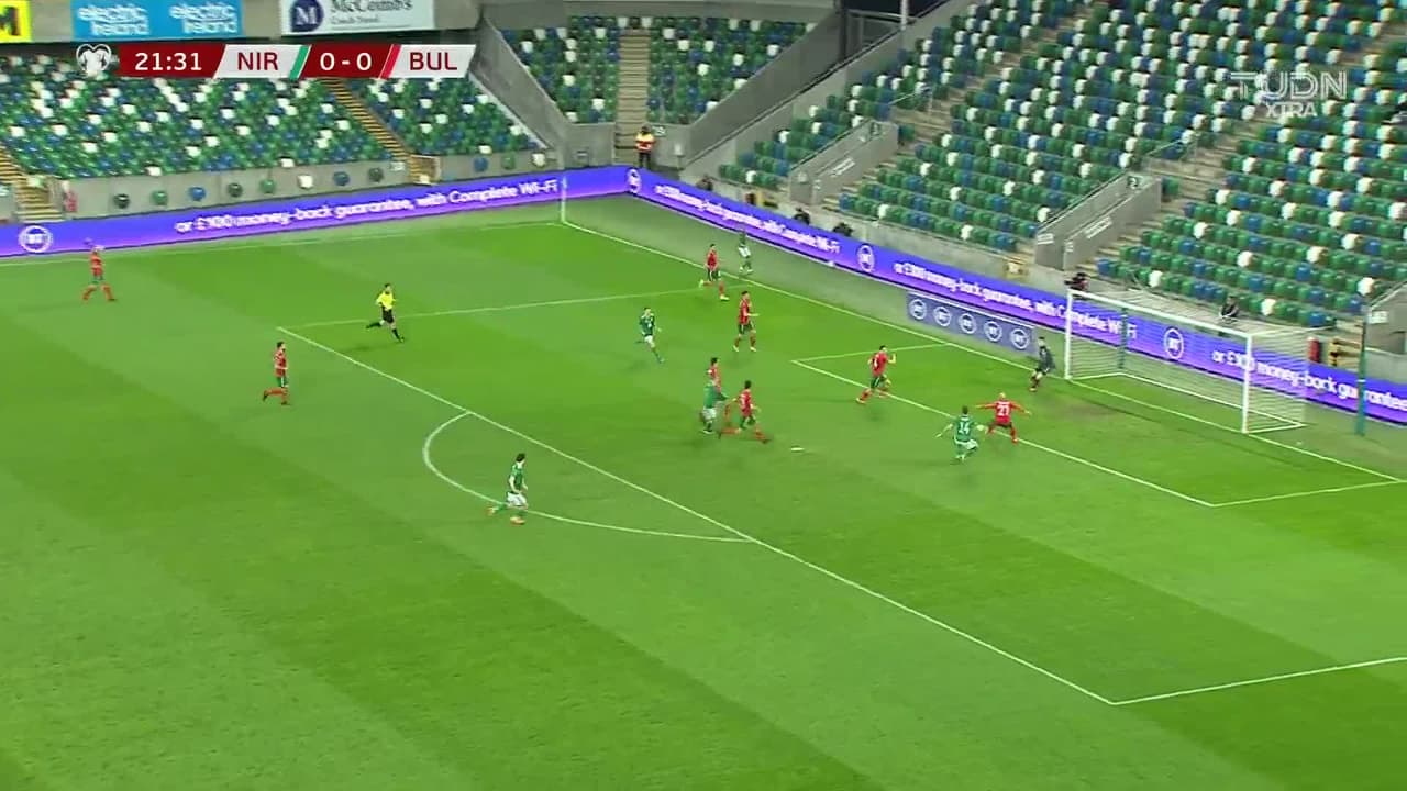 Stuart Dallas (Irlanda del Norte) remata al travesaño| disparo de cabeza desde el centro del área. Asistencia de Josh Magennis con un centro al área.