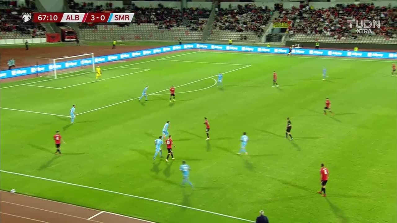 ¡Gol! Albania 4| San Marino 0. Elseid Hysaj (Albania) disparo de cabeza desde el centro del área.