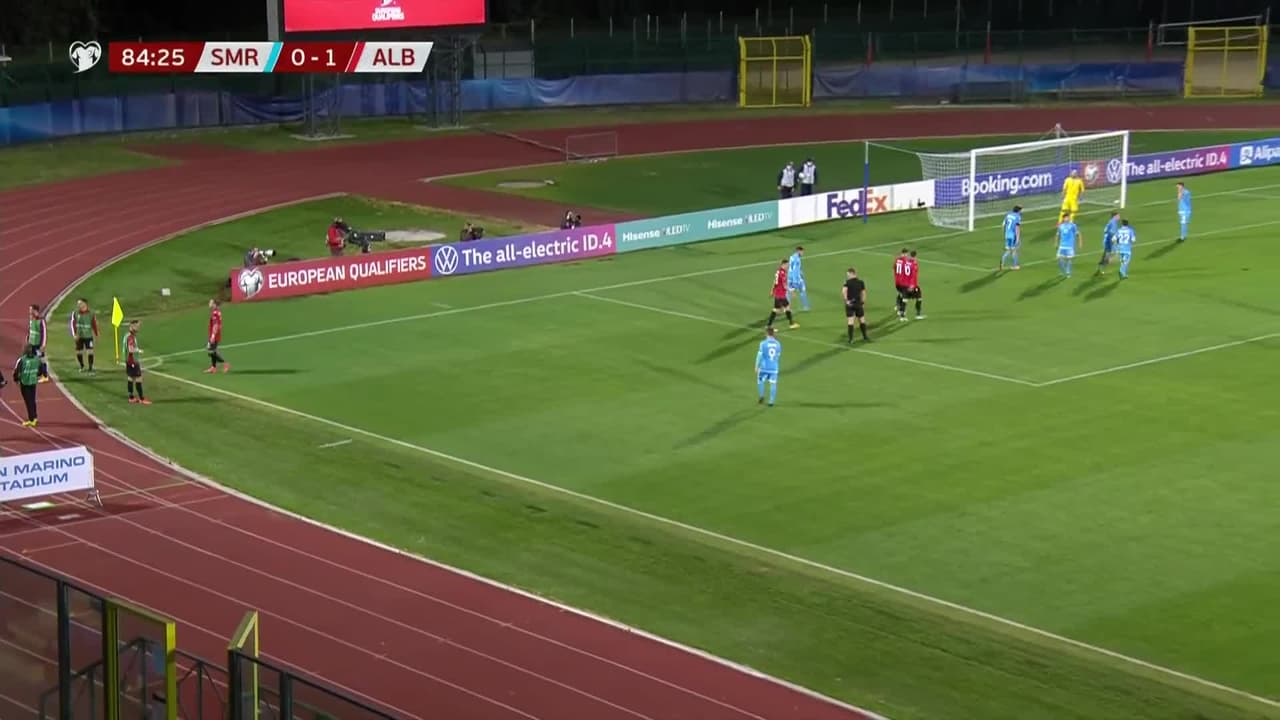 ¡Gol! San Marino 0| Albania 2. Frederic Veseli (Albania) zurdazo a quemarropa desde el lado derecho tras un saque de esquina.