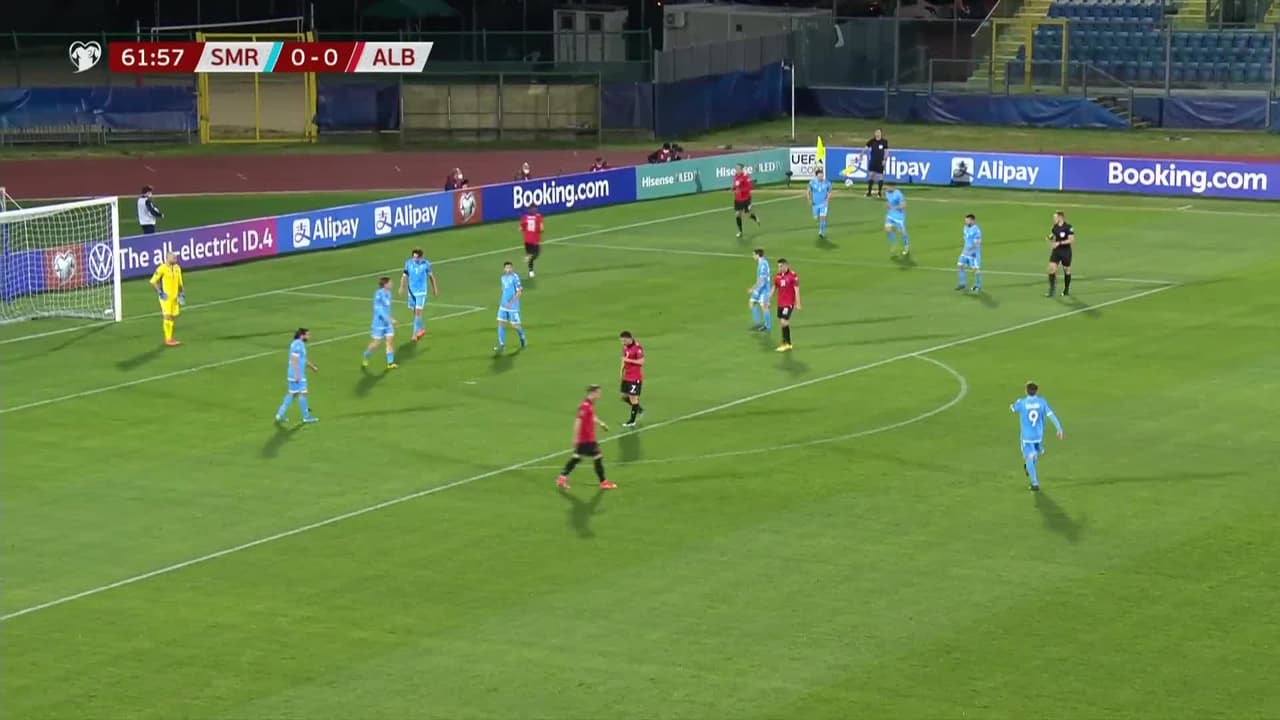 ¡Gol! San Marino 0| Albania 1. Rey Manaj (Albania) disparo de cabeza desde muy cerca tras un saque de esquina.