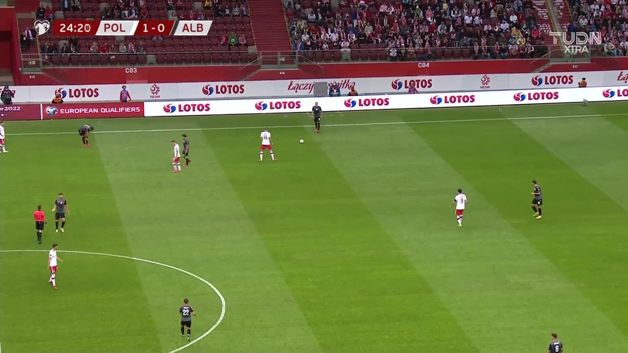 ¡Gol! Polonia 1| Albania 1. Sokol Cikalleshi (Albania) zurdazo desde el lado izquierdo dentro del área.