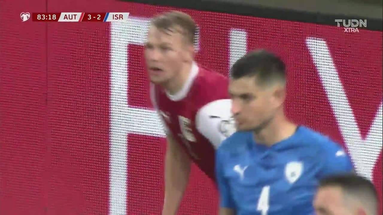 ¡Gol! Austria 4| Israel 2. Marcel Sabitzer (Austria) Disparo con la derecha desde fuera del área disparo rastrero| junto al palo izquierdo.