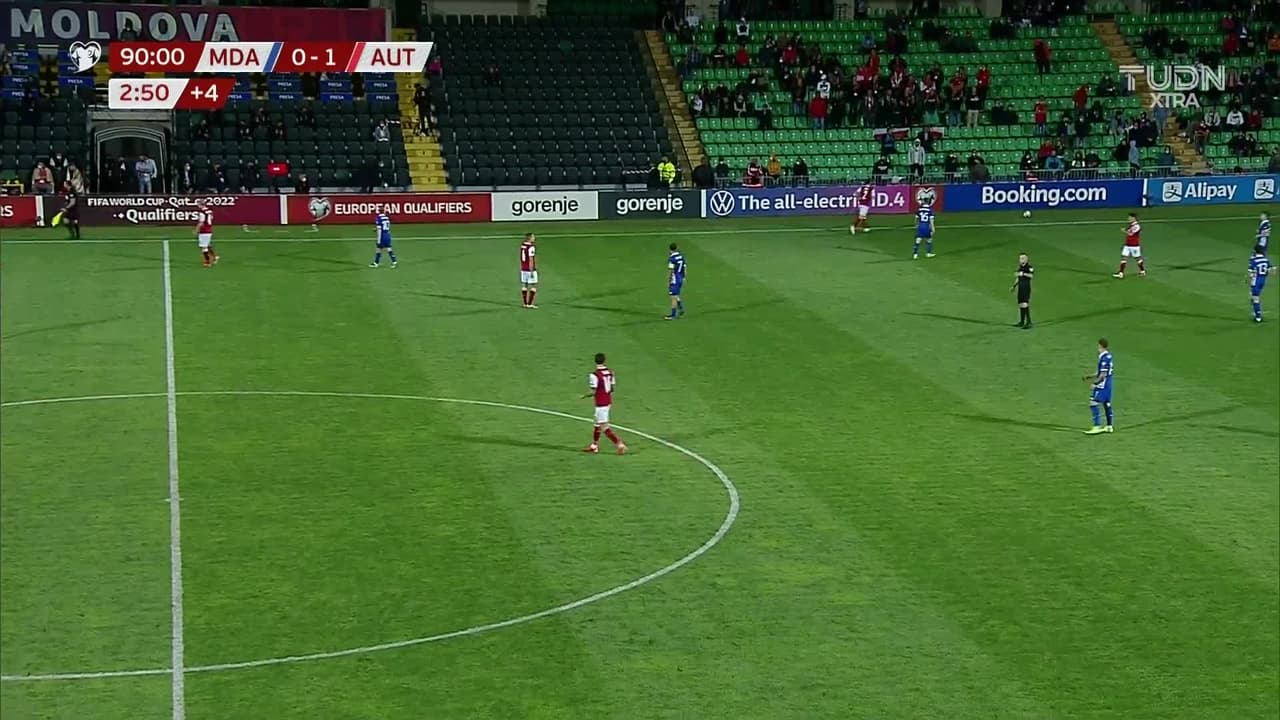 ¡Gooooool! Moldavia 0| Austria 2. Marko Arnautovic (Austria) remate con la derecha desde el centro del área al centro de la portería. Asistencia de David Alaba después de un pase en profundidad.