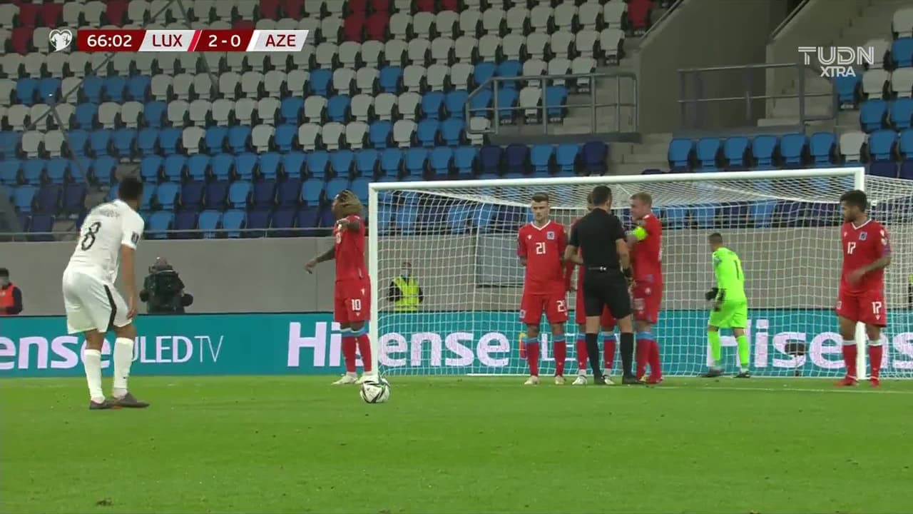¡Gooooool! Luxemburgo 2, Azerbaiyán 1. Emin Mahmudov (Azerbaiyán) marca de libre directo, remate con la derecha a la escuadra derecha.