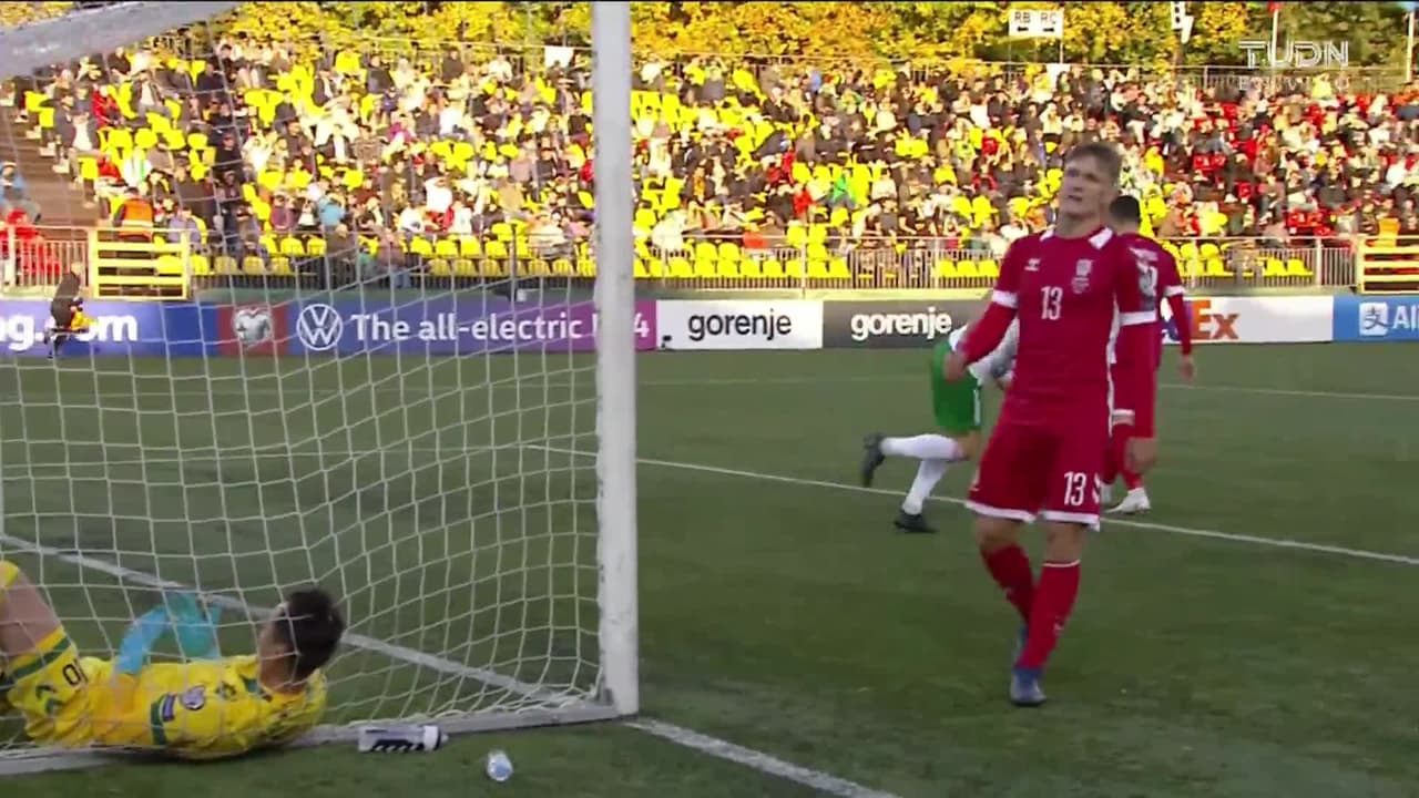 ¡Gol! Lituania 1| Bulgaria 1. Kiril Despodov (Bulgaria) marca de tiro libre directo| Disparo con la derecha.