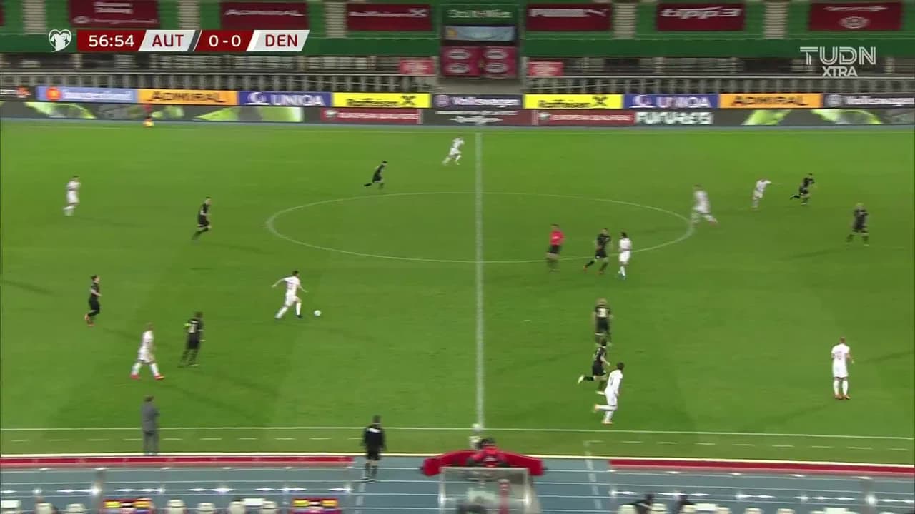 ¡Gol! Austria 0| Dinamarca 1. Andreas Skov Olsen (Dinamarca) Disparo con la derecha a quemarropa desde el lado derecho por arriba. Asistencia de Thomas Delaney.