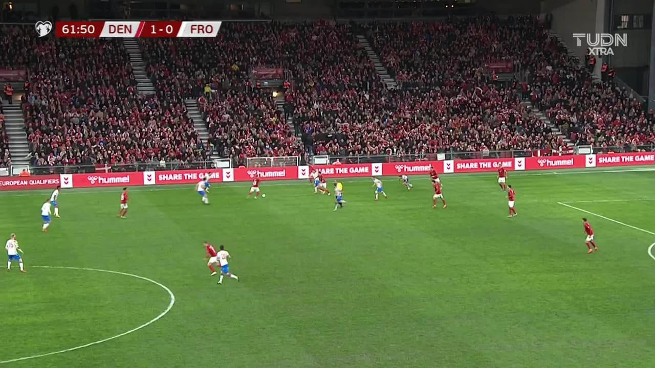 ¡Gol! Dinamarca 2| Islas Faroe 0. Jacob Bruun Larsen (Dinamarca) zurdazo desde muy cerca disparo rastrero| junto al palo izquierdo. Asistencia de Yussuf Poulsen.