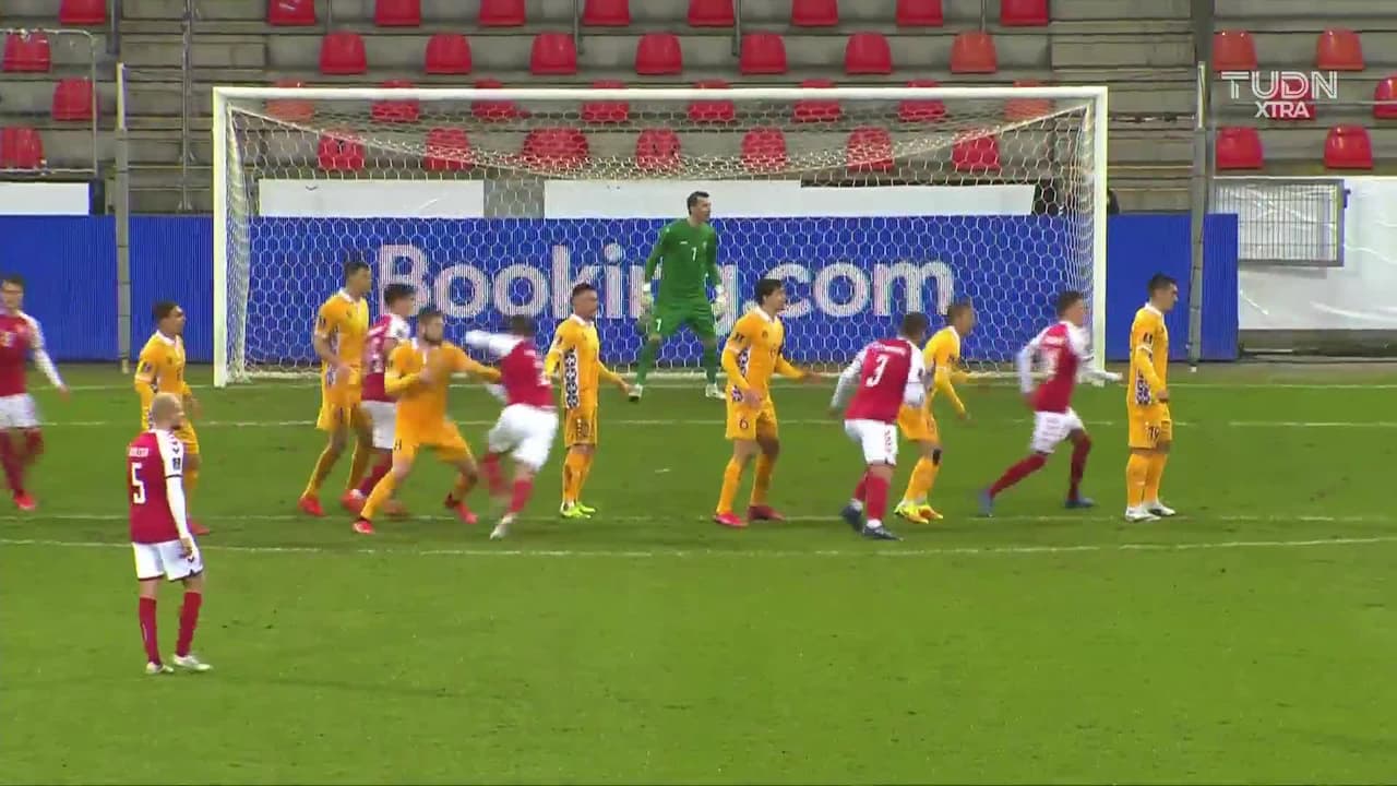 ¡Gol! Dinamarca 1| Moldova 0. Kasper Dolberg (Dinamarca) convirtió el penalti Disparo con la derecha.