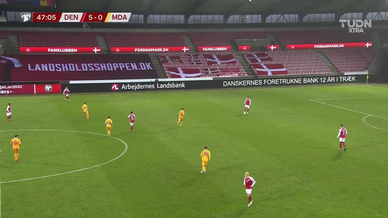¡Gol! Dinamarca 6| Moldova 0. Kasper Dolberg (Dinamarca) disparo de cabeza desde muy cerca por el lado derecho de la portería. Asistencia de Mikkel Damsgaard.