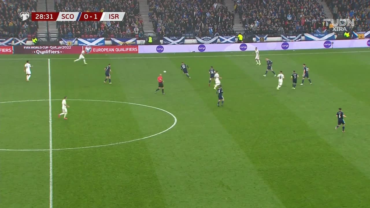 ¡Gol! Escocia 1| Israel 1. John McGinn (Escocia) zurdazo desde el centro del área al ángulo superior izquierdo. Asistencia de Andrew Robertson.
