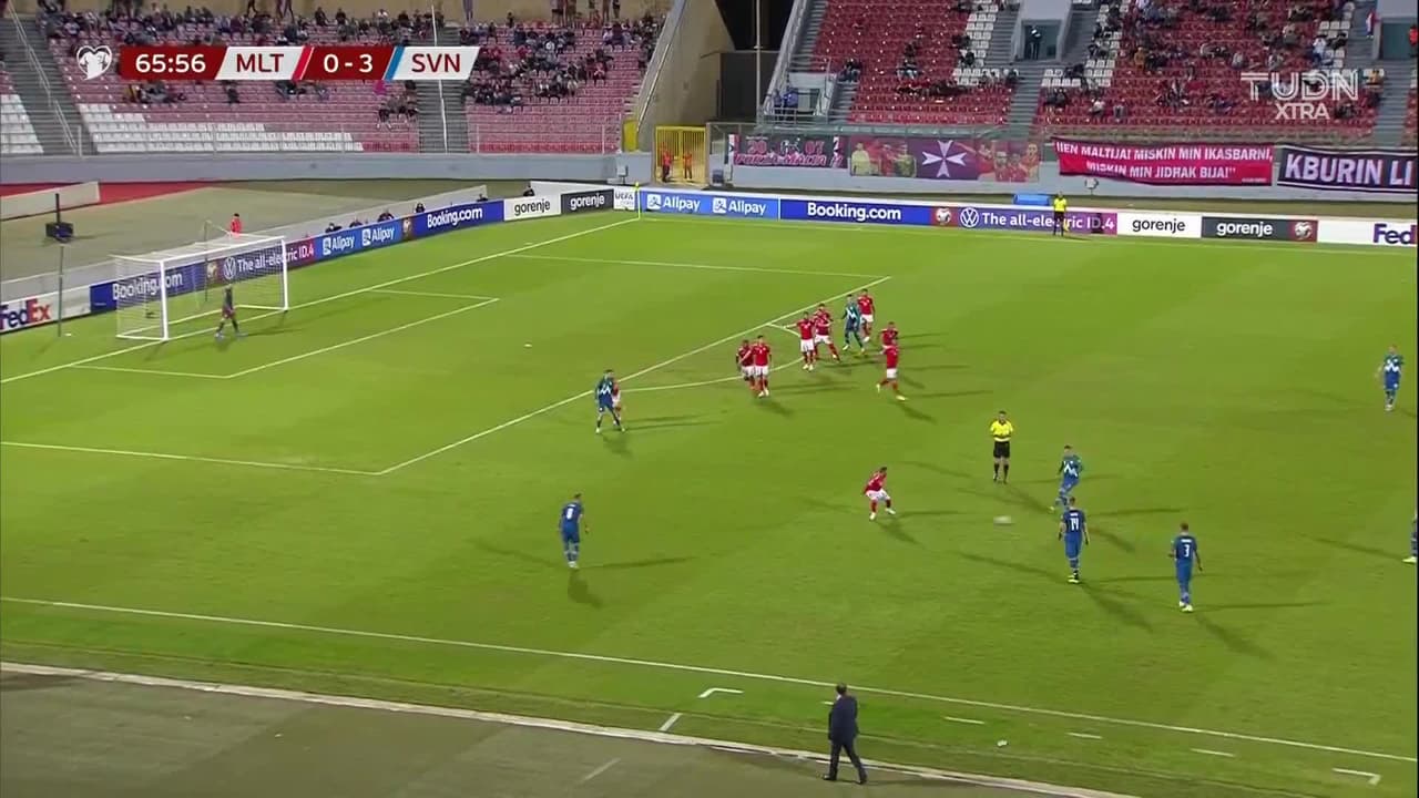 ¡Gol! Malta 0| Eslovenia 4. Benjamin Sesko (Eslovenia) disparo de cabeza a quemarropa desde el lado derecho disparo rastrero| junto al palo izquierdo. Asistencia de Sandi Lovric con un centro al área tras el cobro de una falta.