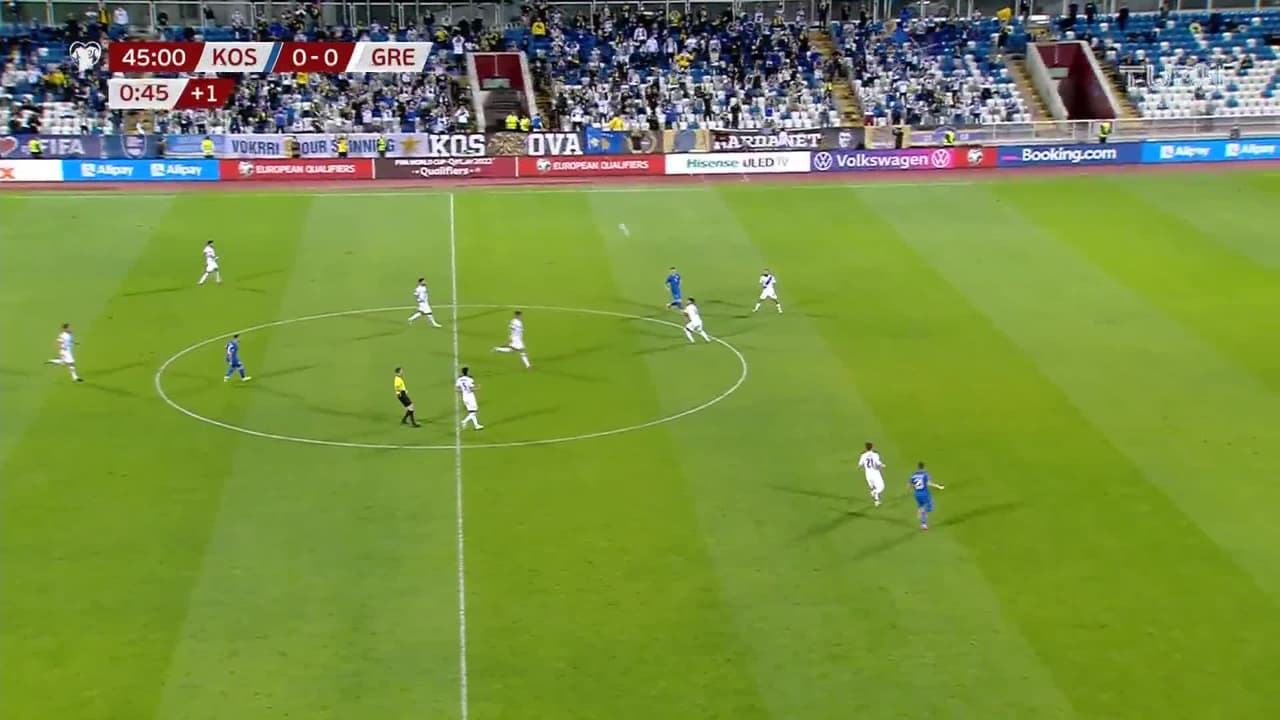 ¡Gooooool! Kosovo 0| Grecia 1. Anastasios Douvikas (Grecia) remate con la derecha desde el centro del área por el lado derecho de la portería. Asistencia de Anastasios Bakasetas.
