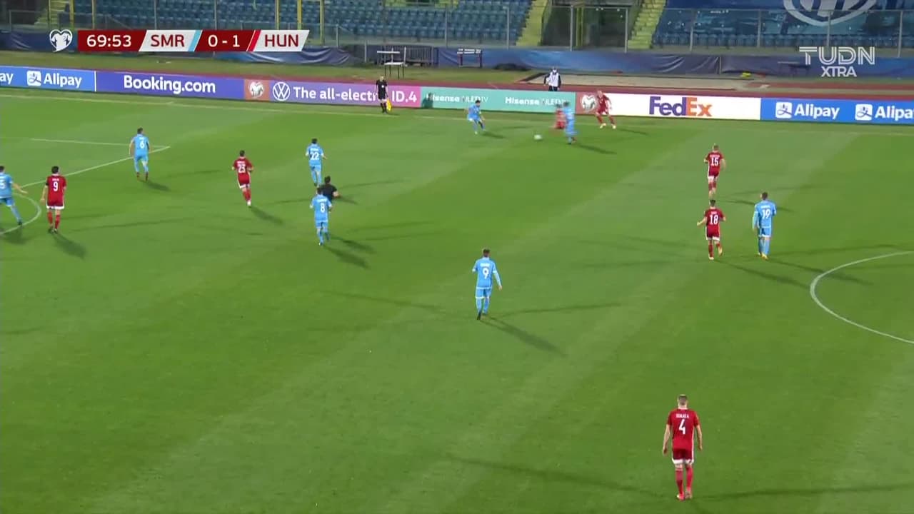 ¡Gol! San Marino 0| Hungría 2. Roland Sallai (Hungría) disparo de cabeza a quemarropa desde el lado izquierdo.