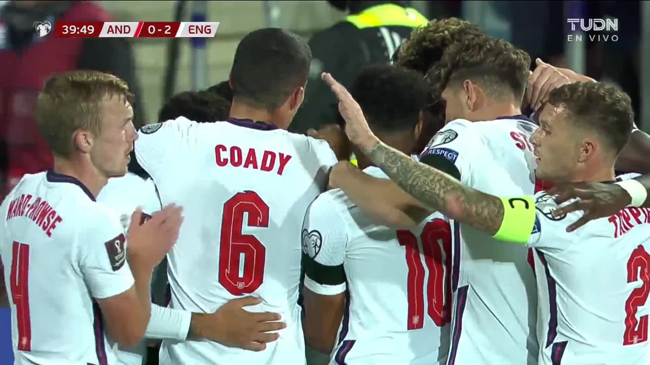 ¡Gol! Andorra 0| Inglaterra 2. Bukayo Saka (Inglaterra) zurdazo sin ángulo desde la derecha.