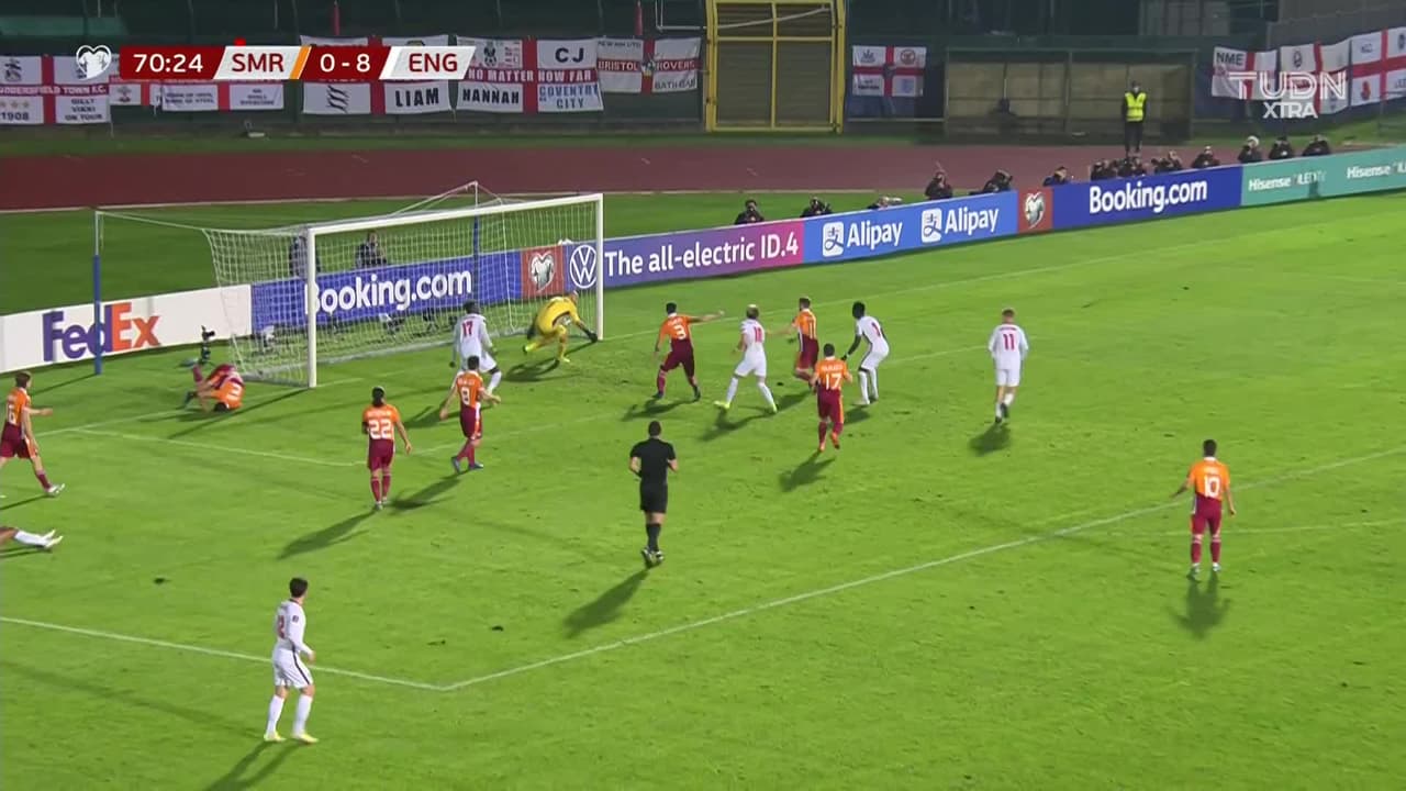 ¡Gol! San Marino 0| Inglaterra 9. Jude Bellingham (Inglaterra) Disparo con la derecha desde el centro del área.