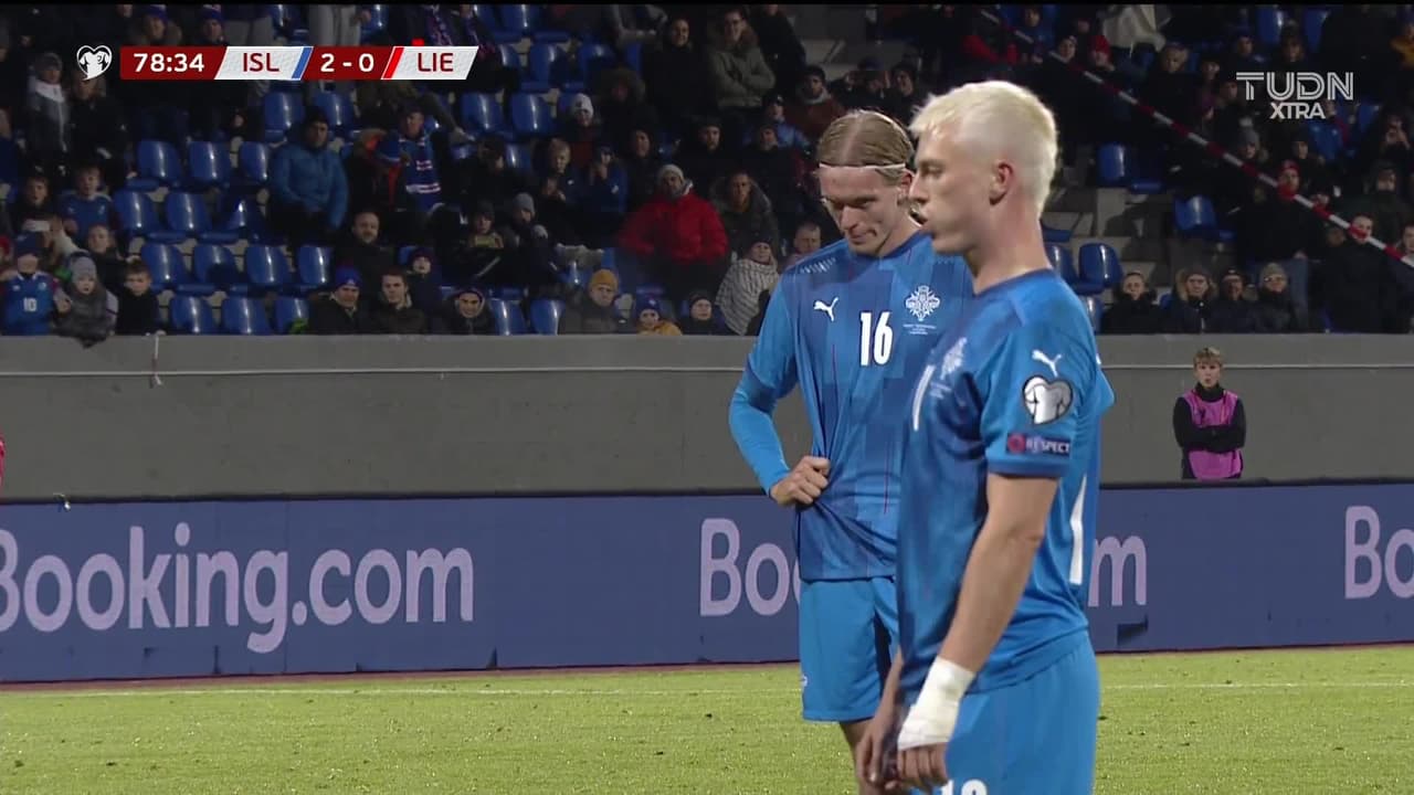 ¡Gol! Islandia 3| Liechtenstein 0. Albert Gudmundsson (Islandia) convirtió el penalti Disparo con la derecha.