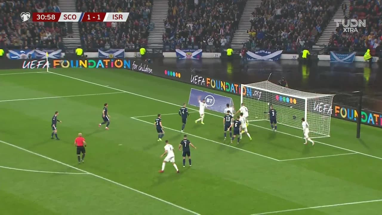 ¡Gol! Escocia 1| Israel 2. Munas Dabbur (Israel) Disparo con la derecha a quemarropa desde el lado izquierdo disparo rastrero| junto al palo izquierdo tras el cobro de una falta.