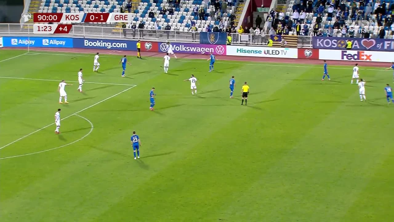 ¡Gooooool! Kosovo 1| Grecia 1. Vedat Muriqi (Kosovo) remate de cabeza desde muy cerca a la escuadra derecha. Asistencia de Florent Hadergjonaj con un pase de cabeza.