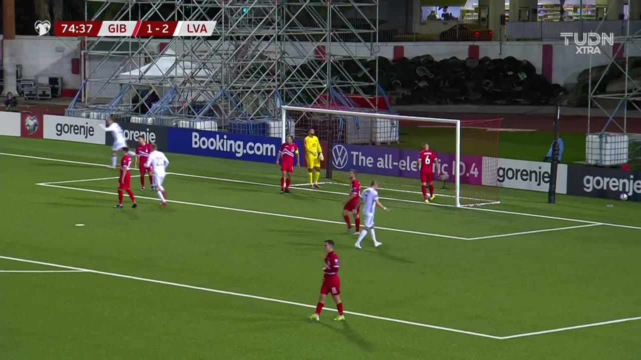 ¡Gol! Gibraltar 1| Letonia 3. Raimonds Krollis (Letonia) disparo de cabeza a quemarropa desde el lado izquierdo.
