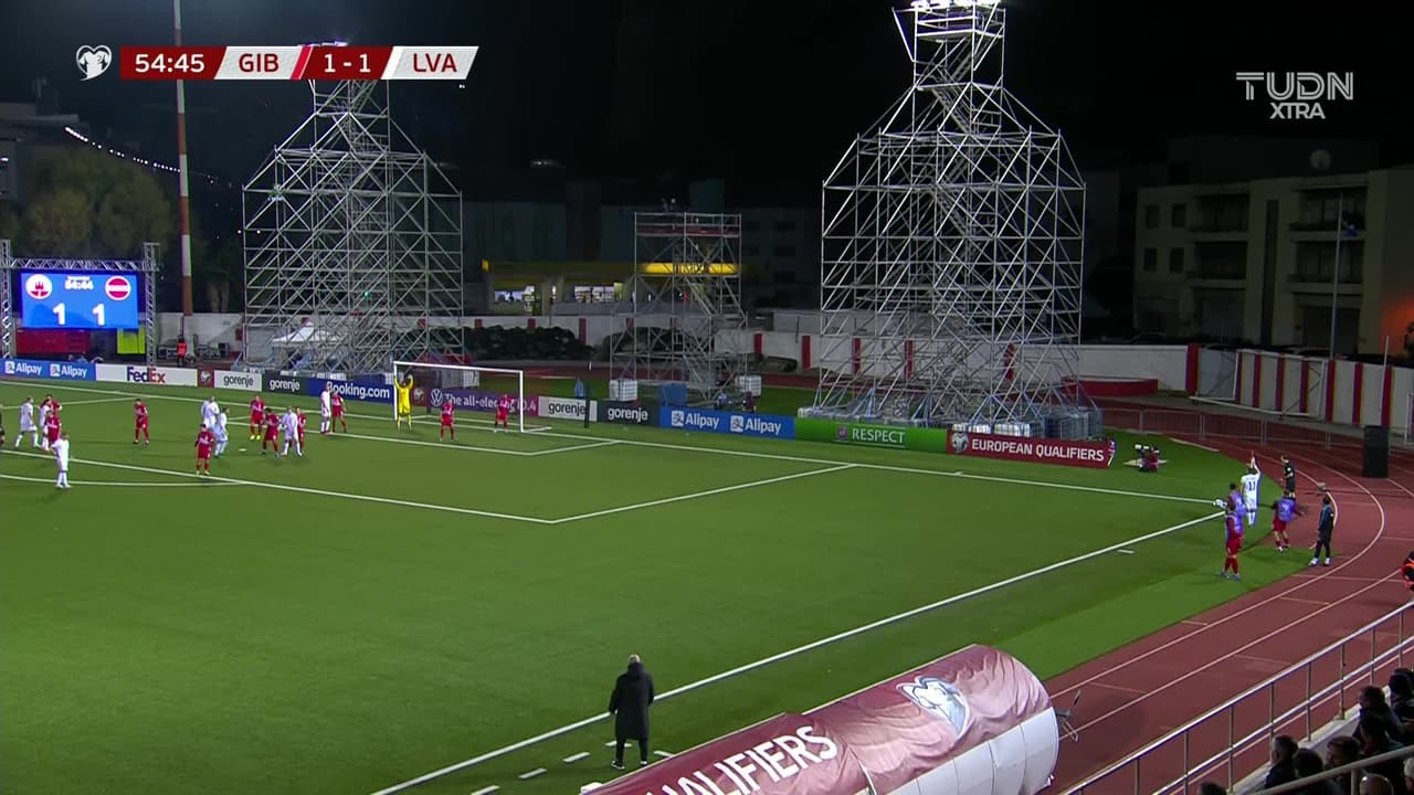 ¡Gol! Gibraltar 1| Letonia 2. Roberts Uldrikis (Letonia) Disparo con la derecha desde el centro del área al ángulo superior izquierdo. Asistencia de Kaspars Dubra tras un saque de esquina.
