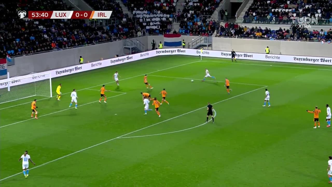 ¡Gol! Luxemburgo 1| Irlanda 0. Danel Sinani (Luxemburgo) Disparo con la derecha desde el centro del área.