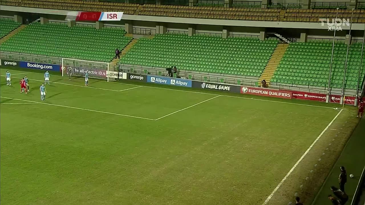 ¡Gol! Moldova 1| Israel 0. Catalin Carp (Moldova) Disparo con la derecha a quemarropa desde el lado izquierdo tras un saque de esquina.