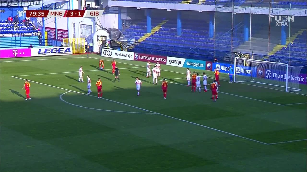 ¡Gol! Montenegro 4| Gibraltar 1. Stevan Jovetic (Montenegro) marca de tiro libre directo| Disparo con la derecha.
