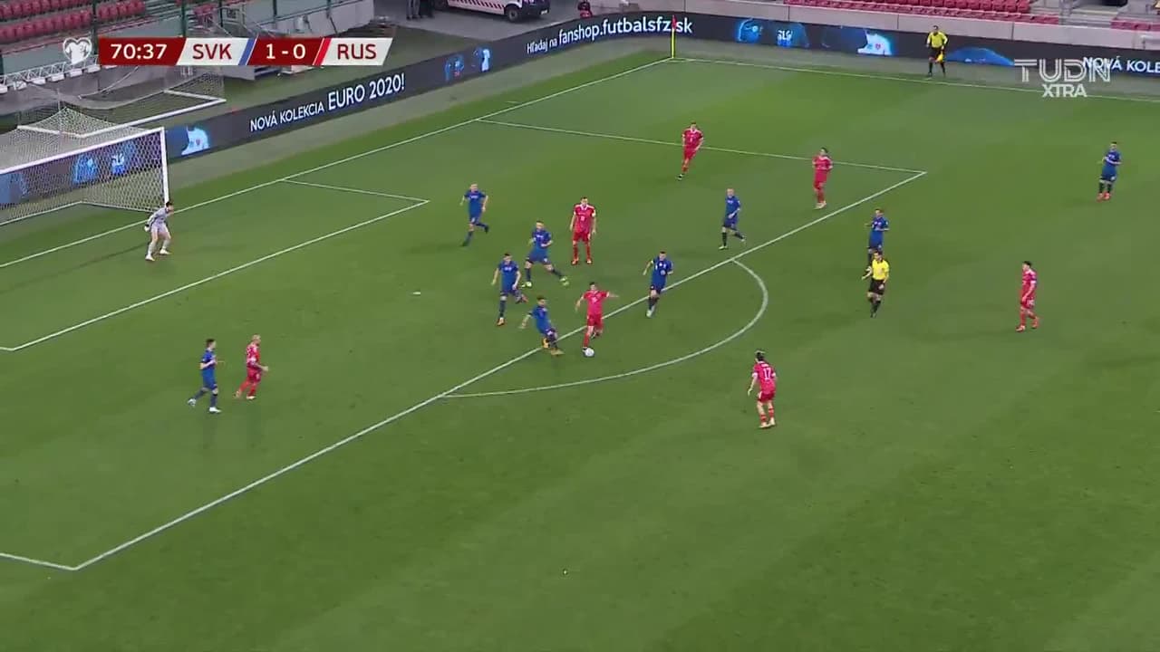 ¡Gol! Eslovaquia 1| Rusia 1. Mario Fernandes (Rusia) Disparo con la derecha desde el centro del área.