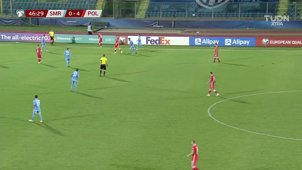 ¡Gooooool! San Marino 1| Polonia 4. Nicola Nanni (San Marino) remate con la derecha desde fuera del área.