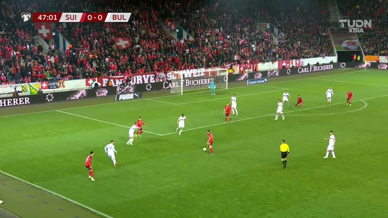 ¡Gol! Suiza 1| Bulgaria 0. Noah Okafor (Suiza) disparo de cabeza desde muy cerca por arriba. Asistencia de Xherdan Shaqiri con un centro al área.