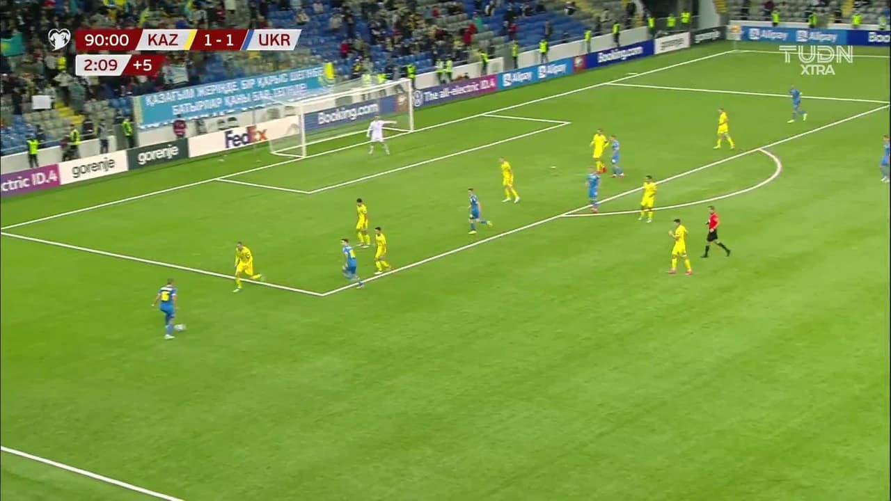¡Gooooool! Kazajistán 1, Ucrania 2. Danylo Sikan (Ucrania) remate con la izquierda desde muy cerca por bajo, junto al palo izquierdo.