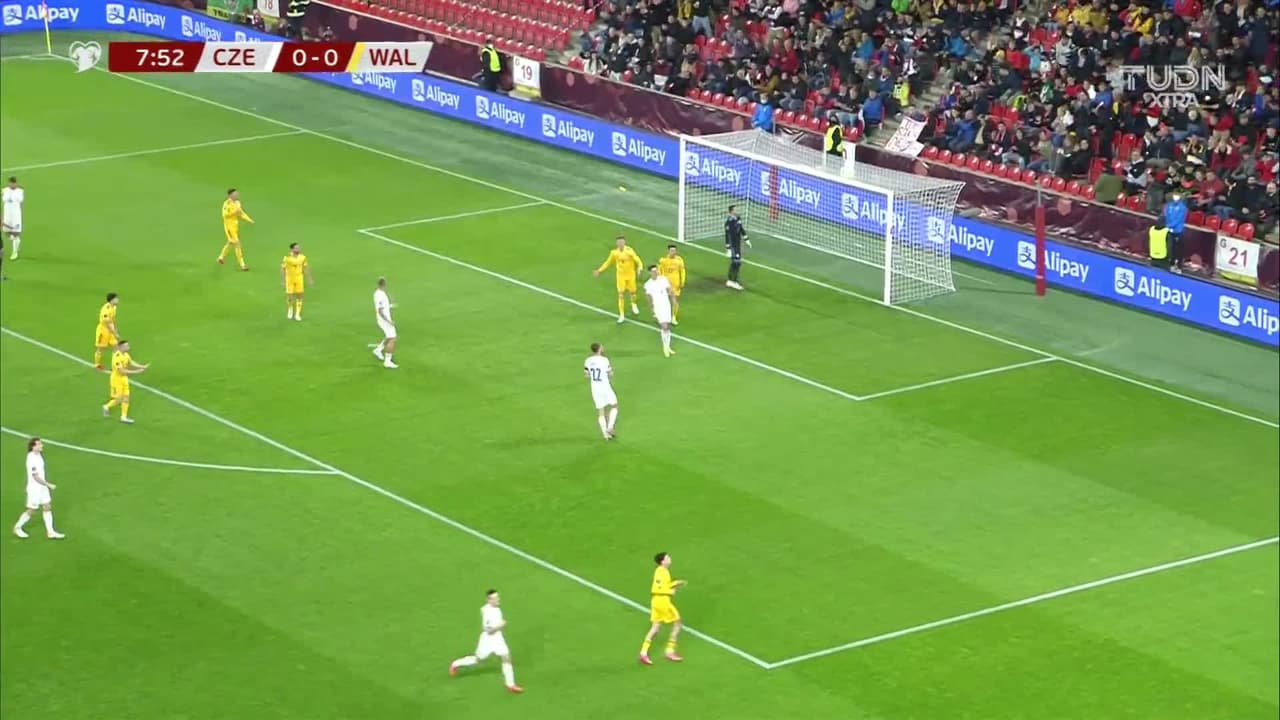 Tiro atajado. Adam Hlozek (República Checa) Disparo con la derecha desde el centro del área.